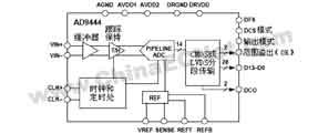 图1是14位模数转换器(ADC)AD9444的内部结构框图。AD9444的采样速率为80MSPS,高SFDR扩大了无线基站接收机的动态范围,提高了服务质量并降低了成本。AD9444拥有片上基准电压和跟踪保持电路,输出时钟使数据的输出简单化,并且当信号超过所选择的信号范围时输出提示。AD9444的LVDS输出可连接AD6636多通道宽带数字下变频器,特别适合于TigerSHARC处理器。此外,当AD9444和AD9510时钟分配器一起使用时,AD9444便可以获得一个优良的时钟源。